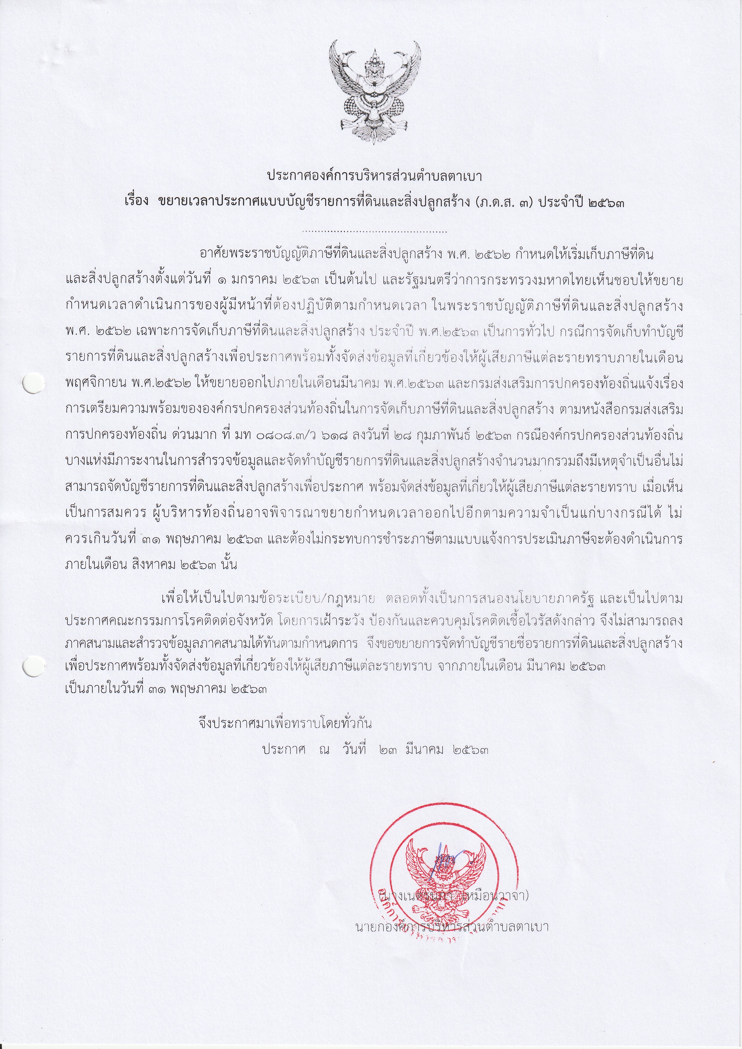 ประกาศองค์การบริหารส่วนตำบลตาเบา เรื่อง ขยายเวลาประกาศแบบบัญชีรายการที่ดินและสิ่งปลูกสร้าง (ภดส.3) ปี 2563