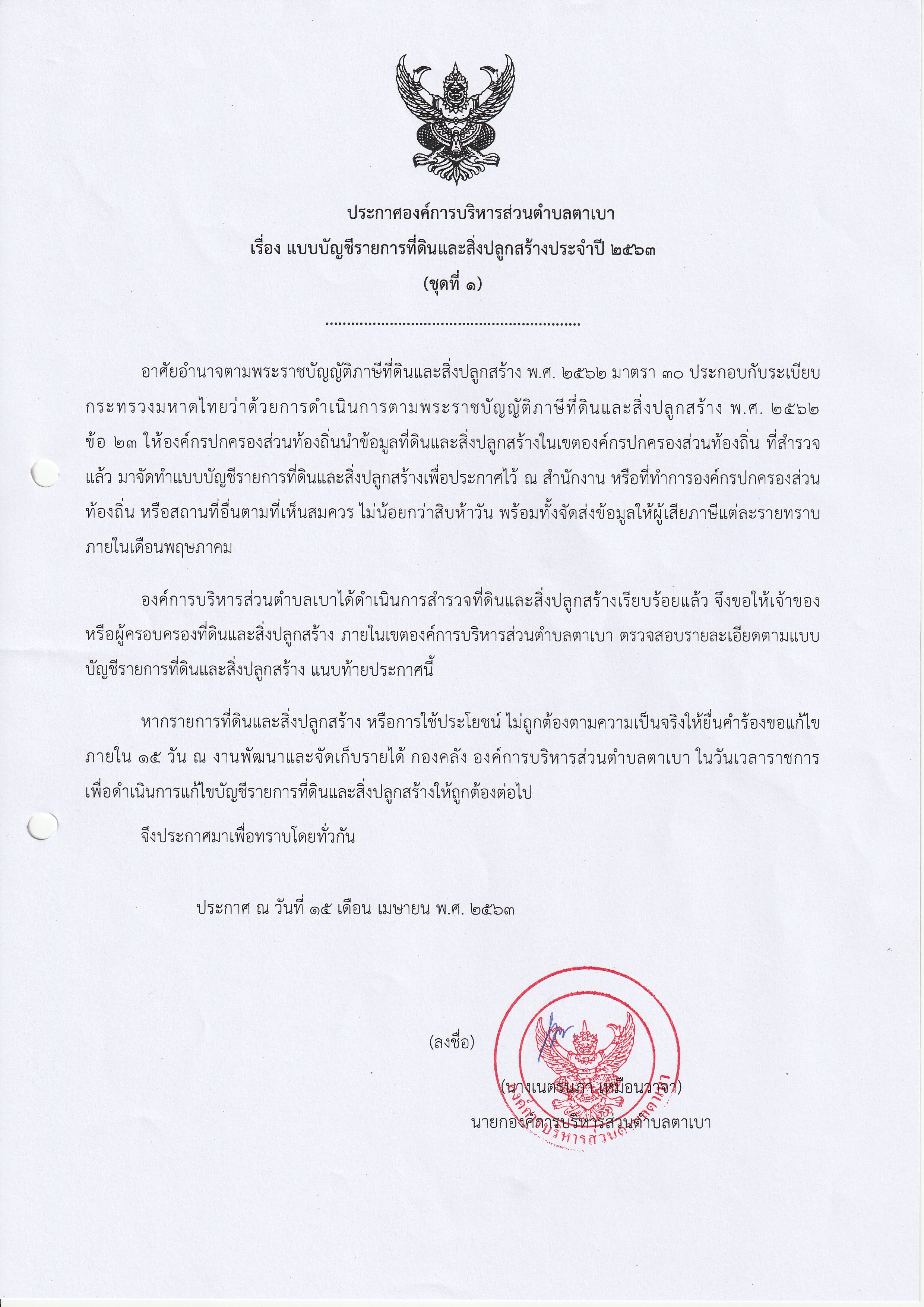 ประกาศองค์การบริหารส่วนตำบลตาเบา เรื่อง แบบบัญชีรายการที่ดินและสิ่งปลูกสร้างประจำปี 2563