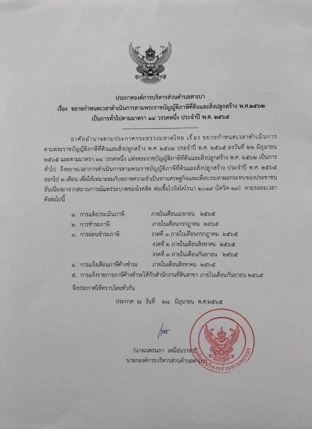 ประกาศองค์การบริหารส่วนตำบลตาเบา เรื่อง การขยายกำหนดเวลาดำเนินการตามพระราชบัญญัติภาษีที่ดินและสิ่งปลูกสร้าง พ.ศ. 2562 ประจำปี พ.ศ. 2565
