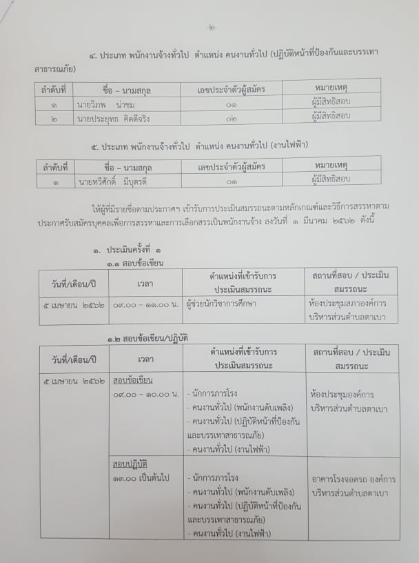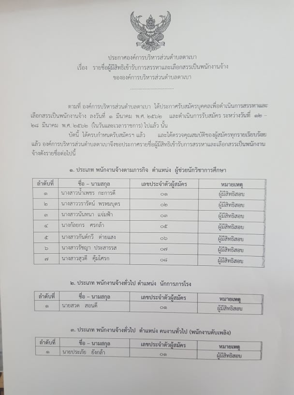 ประกาศรายชื่อผู้มีสิทธิเข้ารับการสรรหาและเลือกสรรเป็นพนักงานจ้าง ของ อบต.ตาเบา