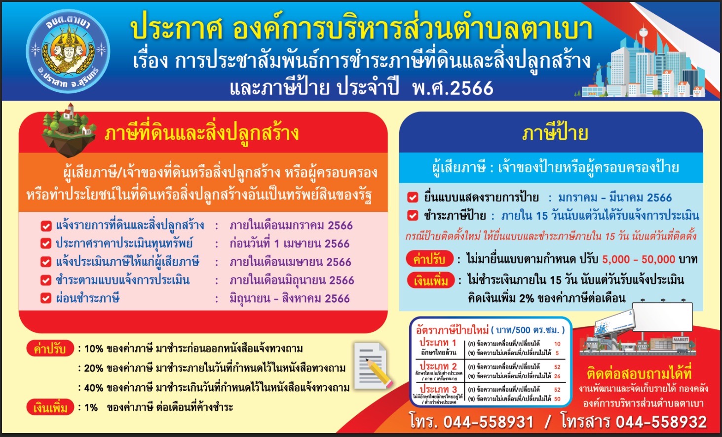 ประกาศ องค์การบริหารส่วนตำบลตาเบา เรื่อง การประชาสัมพันธ์การชำระภาษีที่ดินและสิ่งปลูกสร้างและภาษีป้าย ประจำปี พ.ศ.2566